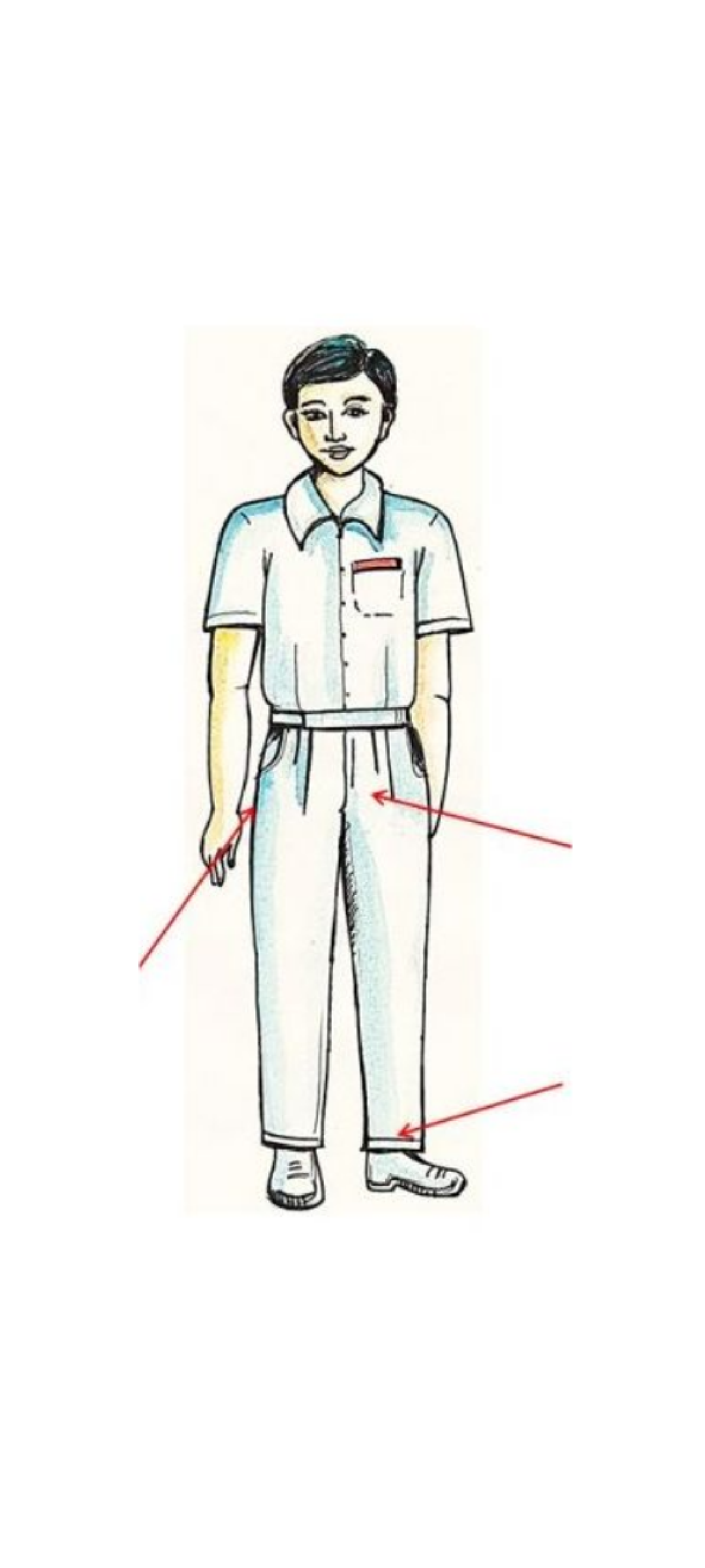 - කලිසමේ පසුපස සාක්කුව දකුණු පසින් තිබිය යුතුය.
